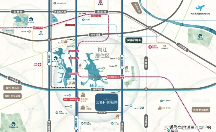 项目坐落于外环南路与解放南路交叉口西北角,占据梅江南核心区位,与河西仅一河之隔。这里不仅是天津“一轴两带”发展战略的关键节点,更因2025年上合峰会落址梅江会展中心,迎来城市界面的全面升级。
