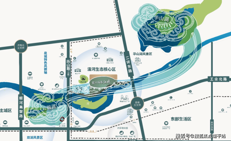 3、公园绿地:于二环东路与小清河北路交汇处,背靠华山黄台山,南观小清河,背山面水,山主人丁水主财