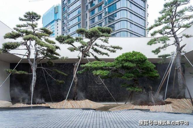 其中主门口的3株日本进口古松,据悉每棵价格超百万,搭配大门口的“水上升明月”艺术雕塑,互相辉映。