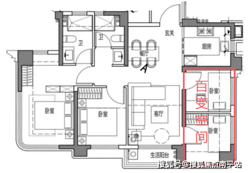 第二个突破是 实现了标准的四开间朝南,主要起居室都设置在南面。并且生活阳台不与客厅连接,避免了客人来的时候看到晾晒区的尴尬。