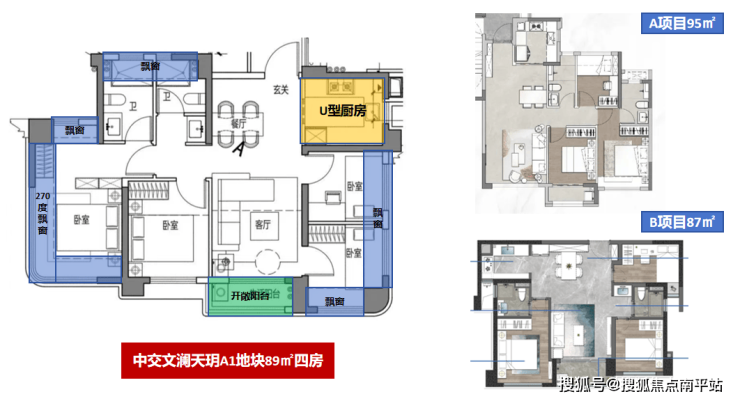 中交文澜天玥89㎡户型,做到 四房+四面宽朝南+全明采光+U型厨房+主卧270°观景,保障了主要居室和客厅都处于景观面上,享受更好的采光通风。