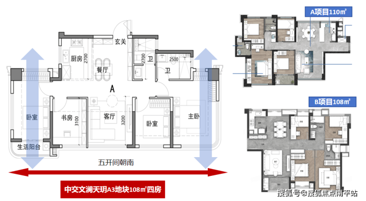 模式1是A3地块 南向五面宽108㎡高层户型,我们称之为【 为瞰海而生的户型】。