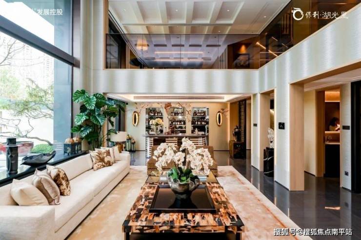 进入到室内,便能看见这样一个画面,大面积的落地玻璃,约6米高的空间挑空。
