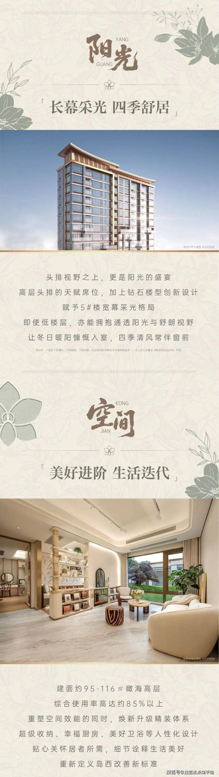 户型设计:高层95㎡户型综合使用率约85%,可实现约110㎡的空间体验,三卧朝南,采光充足;116㎡户型四面宽朝南,部分房源可瞰海景。洋房124㎡户型综合使用率达101%-109%,带入户花园,部分楼层有南向晒台。
