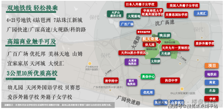教育——自身配建6班幼儿园;周边有广州奥林匹克中学、越秀观樾配建24班小学,缦云广州配建的九年制学校(18班小学+27班中学)等多所高质量学校;