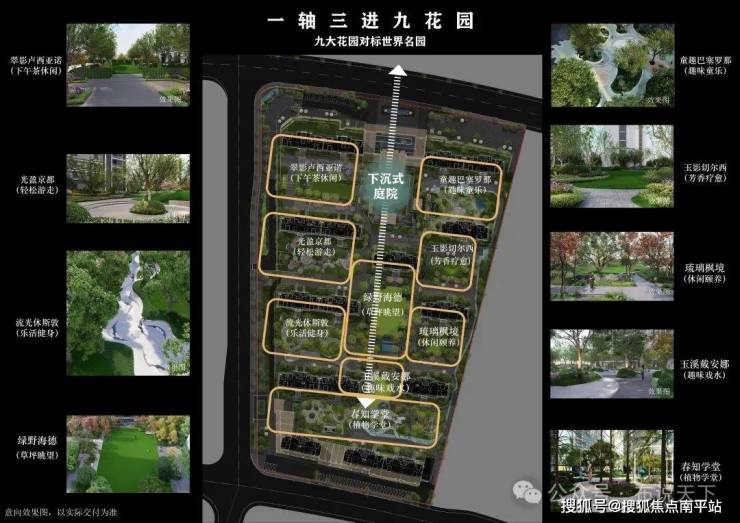 九大花园,即通过中轴划分、以九幅世界名园的意境打造九个组团空间。
