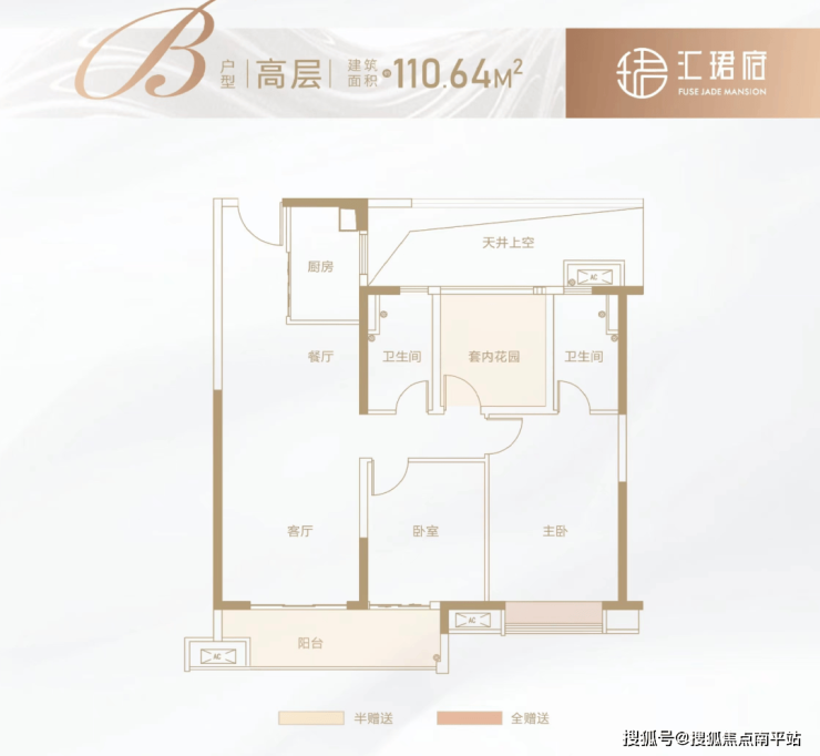 约5.6米南向双连景观阳台+北向套内花园,只计算一半建筑面积;主卧飘窗不计入建筑面积。
