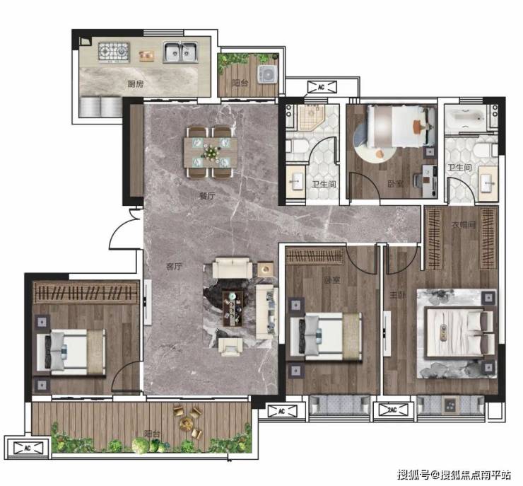 一方面,“三卧室+客厅”共四开间朝南+南北双阳台,将朝南开间、阳台数量做到了J致。
