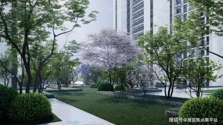 住宅楼栋前,规划设置有浓密的植物组团和艺术景墙;