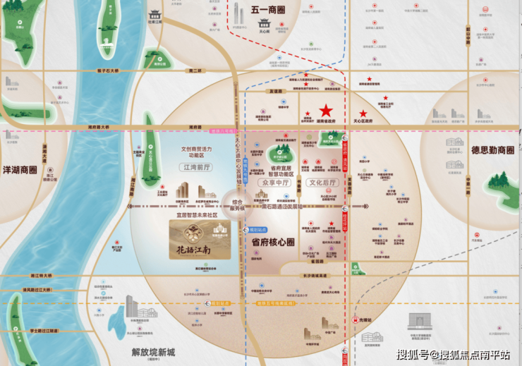 项目位于雨花区合丰路与合庆路交汇处西北角,地处尚东、武广、高桥三大商圈交汇处,紧邻浏阳河风光带。