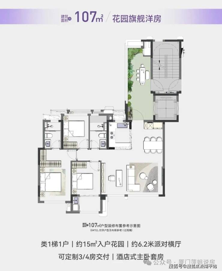 户型面积:建面约 63㎡2 房、79-87㎡3 房两卫、107㎡3-4 房两卫带入户花园、115㎡4 房两卫带入户花园。
