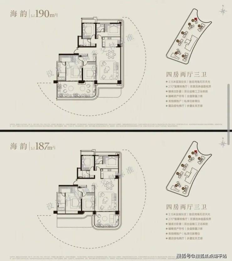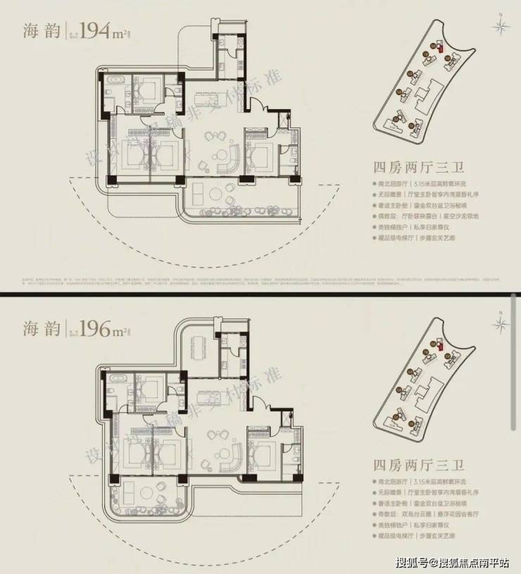 该户型还拥有3.3米满级层高,收获更多的采光、更高的视野面、更清爽的通风。尊贵入户礼序从独立电梯厅中走出,推开家门,是尊崇的归家动线:奢石装点的玄关、环抱式的双侧衣帽鞋区。海景待客餐厅餐厅直面海景,在宴会级大圆桌上与海景共餐;岛台和酒品藏柜,在家中就能拥有海景吧台。奢华主卧可改全套卧,可将南次卧与旁边的衣帽间打通,解锁全套卧体验。此外,该户型还配备了三梯两户,双入户,独立保姆房,顶级豪宅才能拥有的奢阔配置,归家梯与服务梯分离,私密性拉满的同时,电梯效率也达到极致。