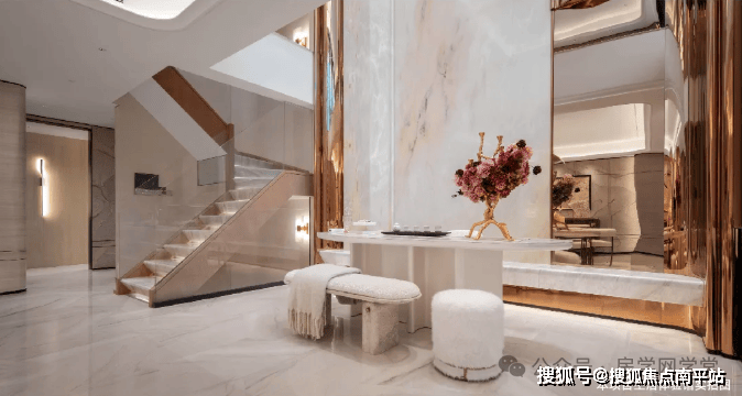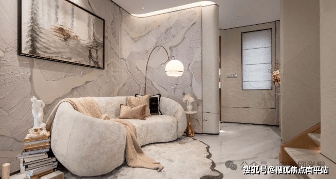 首层「社交艺术」会客厅,以“整层无界”为理念超感通厅设计,实现客厅、挑高、庭院三位一体南北通透的玻璃幕墙,将双庭院景致引入室内6米奢级挑空与夹层互动。