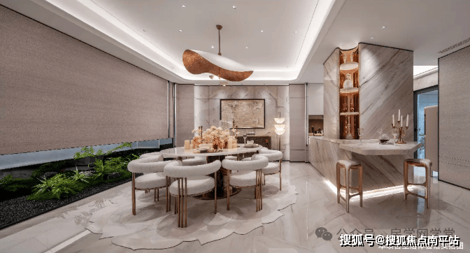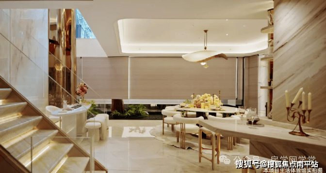 夹层超大尺度餐厅打破传统格局以“夹层即首层”理念重塑空间认知挑空设计与采光井巧妙联动,引入天光云影消弭地下空间的压抑感。