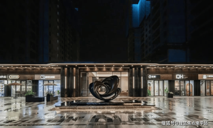 2.品质社区大门:主入口作为社区与城市接驳以及业主归家第一空间,承载了进出与识别、保护与阻隔的重要功能。璀璨学府东入口门楼整体面宽约 45 米(含商业立面),最高位建筑高度约 5.5 米。两翼舒展,同湘府英才益清小学对望,取意鸿翔鸾起,隐喻奋发有为