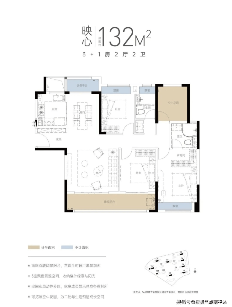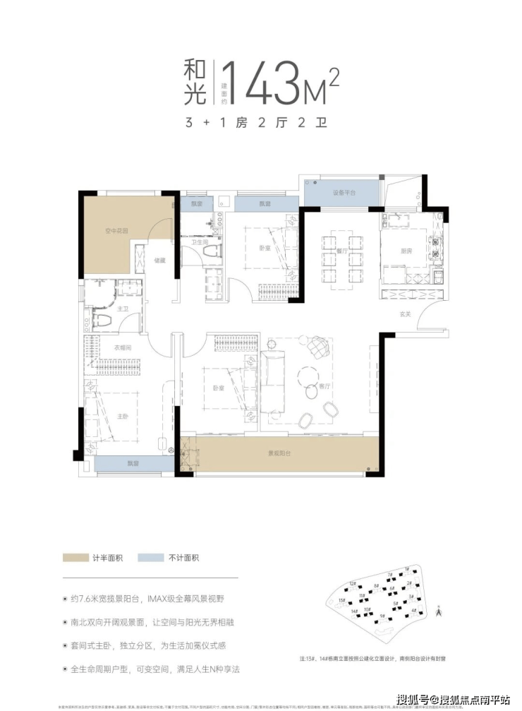 ·建面约132-143㎡3+1房——南北通透布局,南向景观阳台约7.4m(建面约132㎡户型)、约7.65m(建面约143㎡户型),即满足从容会客,亦承载家庭逸趣,约3.8㎡独立玄关入户,扩容收纳空间,U型厨房设计,操作动线流畅,将舒适度发挥到极致