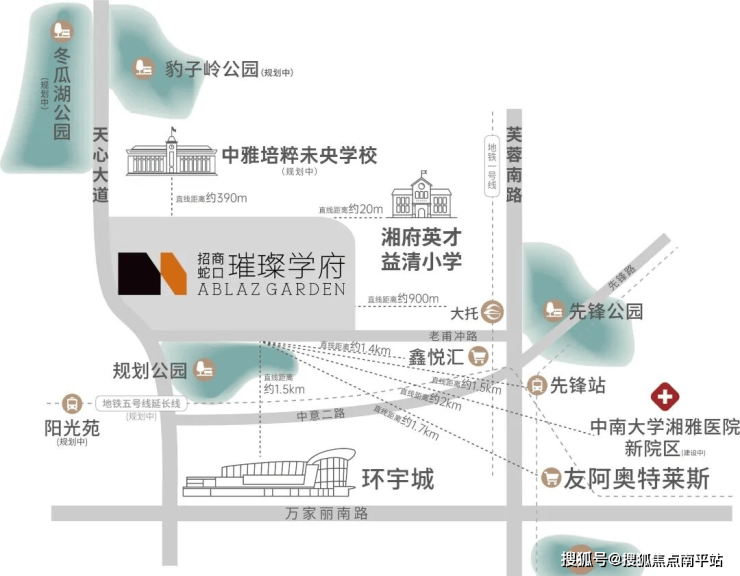 天心的整体建设,沿着天心大道(自天心中心-新开铺板块-黑石铺板块-解放垸板块)高速向南发展。而璀璨学府项目地处天心向南的关键枢纽处,北邻省府、西邻黑石铺及解放垸、南临中信商圈、东临红星,距离奥体中心(规划中)直线距离仅约3公里,享受成熟板块配套利好以及规划板块的未来红利