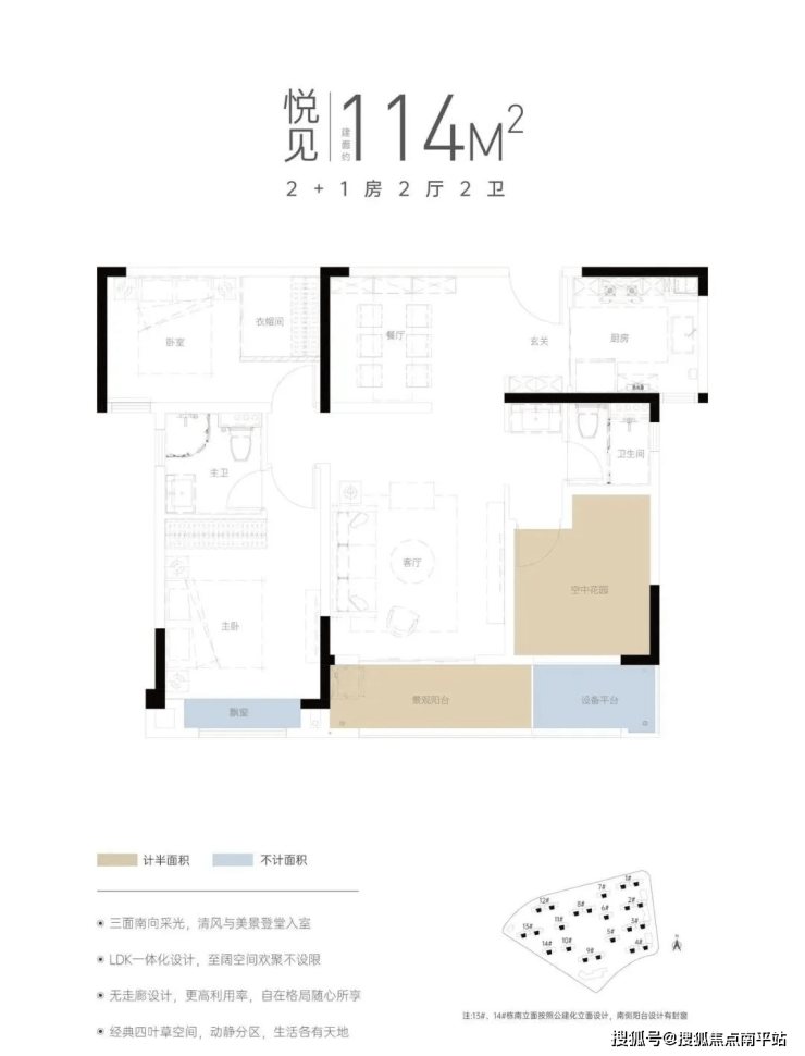 ·建面约114㎡2+1房,三开间朝南,充分考虑家庭成长与均好需求,主次卧开间皆超3米,客餐厅等面宽,营造约30㎡餐客一体空间,各功能区尺度均衡,南向景观阳台开间约6.8米(含设备平台),实现小户型大空间