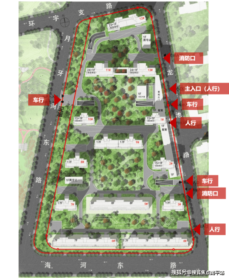 社区3个人行出口均设置在东侧,这样无论是步行去海河畔,还是去地铁站和学校,都有最近路径。