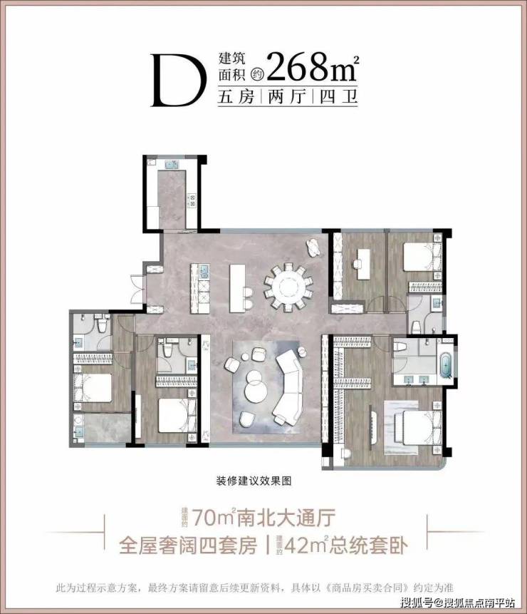 项目占地约3.62万㎡,总建面约12.5万㎡。项目规划7栋高层,层高18-33层,产品共规划有5种户型,115-268㎡四至五房。