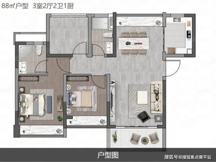 88㎡户型, 3室2厅2卫1厨