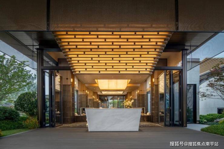 大门主入口引入“把酒店搬回家”的产品理念和“回家即度假”的生活理念,打造奢华酒店式归家大门。屋顶高约9.7米,整体挑檐向两侧延伸,长约49米,庑殿金顶的屋顶形态,以现代化的设计手法融入传统屋顶形式,结合鲁班锁倒影装置传达山水倒影的意境生活。