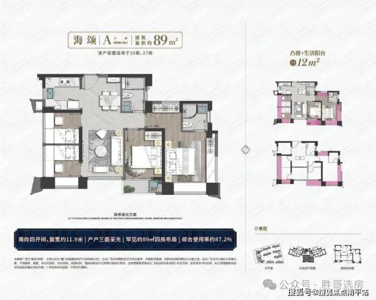 ▷ 89㎡四房四面宽朝南,岛外唯一90㎡内全明四室,赠送面积达12.6㎡