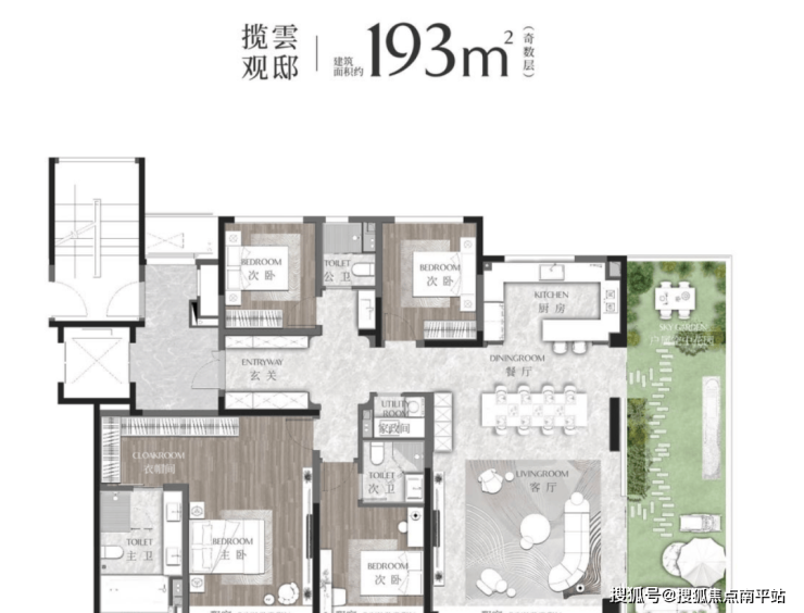 不少购房者喜欢这个户型,大概率就是看中了端厅+空中花园的搭配,约6米大开间的环幕厅设计,搭配巨幕落地窗,整体采光、视野极佳。