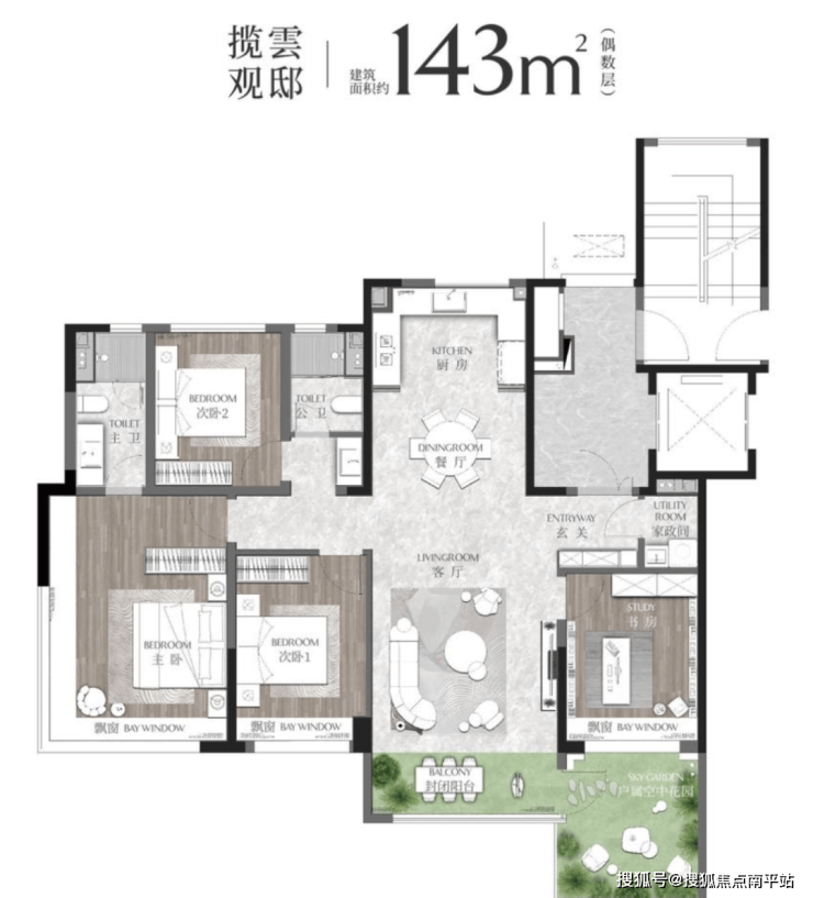 洋房产品,独立电梯厅,再加上大面积飘窗空间+空中花园,整个户型得房率极高,实用性自然更强。