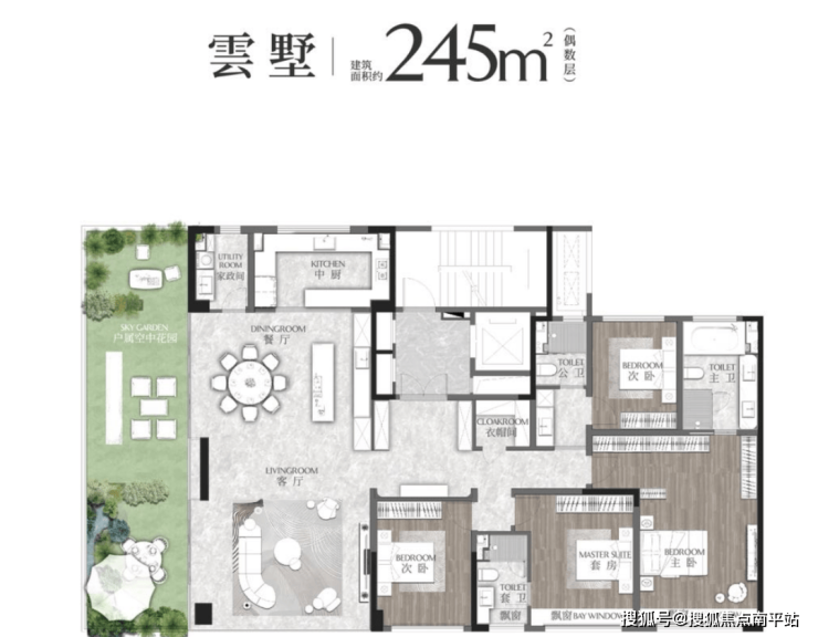 除了193户型外,空中花园更大的245㎡、286㎡户型,尺度更阔绰,空中花园的观景视野更佳,功能性更强。