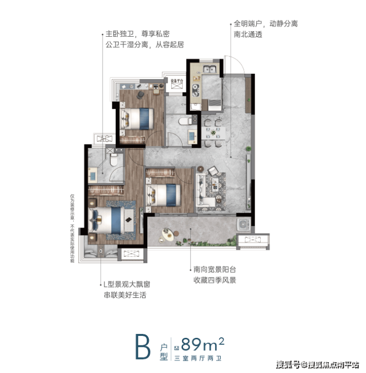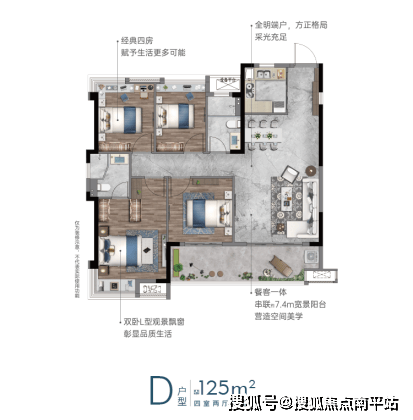 项目建筑面积约63-142m²二至四房灵动空间,满足多样置业需求;户型布局充分考虑人居尺度以及通风采光;大面宽短进深设计、跑马式阳台、270°景观飘窗,纵享环幕视野。