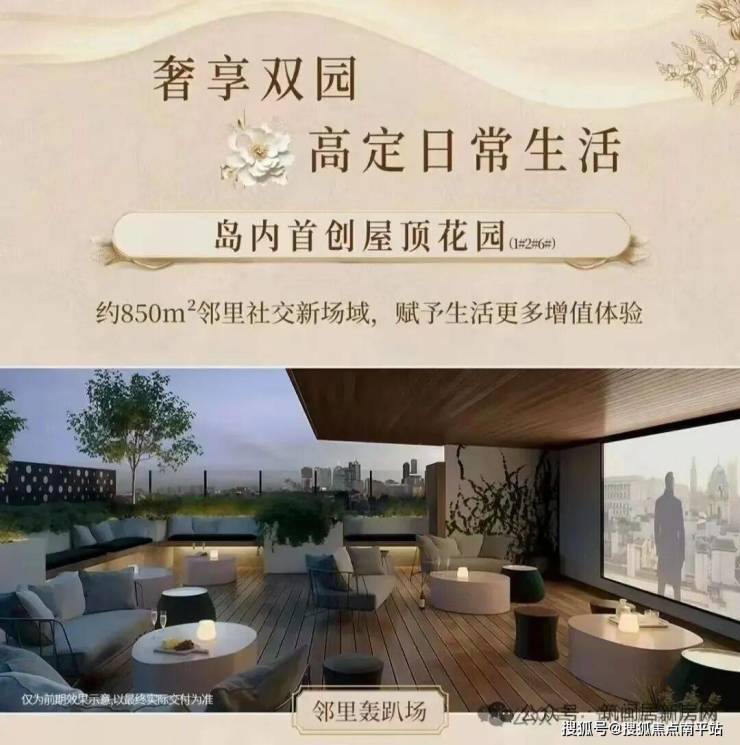 岛内首创的屋顶花园(1、2、6#楼栋配备)和万象收纳系统也是重要卖点。