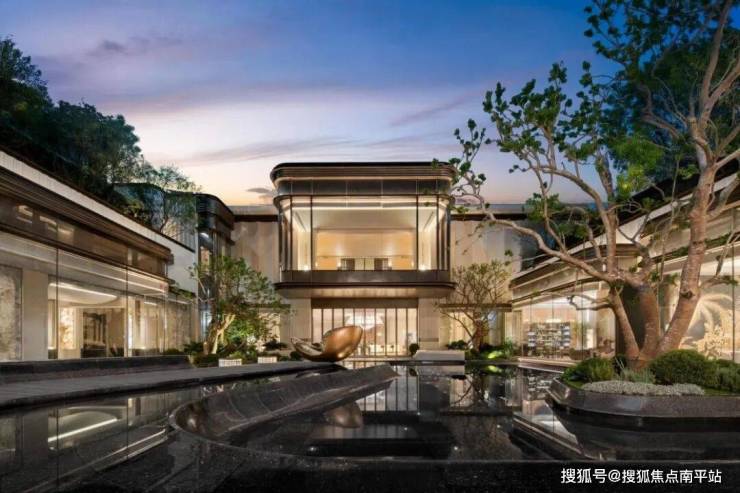 下沉庭院以精致金属线条搭配玻璃材质,极具现代时尚。前庭水景设艺术雕塑和繁茂绿植,镜面透出建筑倒影,自然且舒适。