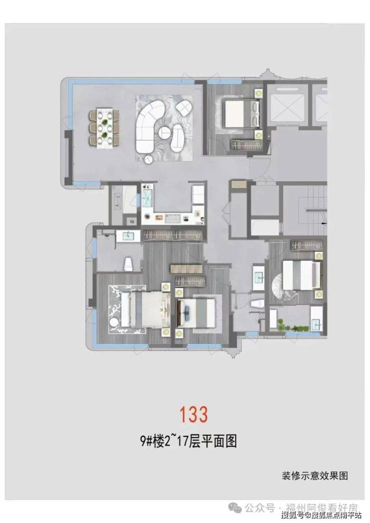 钢结构核心户型,LDKB 大方厅设计,空间可自由拆分(3 房 / 4 房灵活切换);270° 寰幕视野,空中花园与客厅相连,观景尺度拉满;双主卧套房带衣帽间 + 独立卫浴,精装标准对标高端豪宅,适配高净值改善家庭。