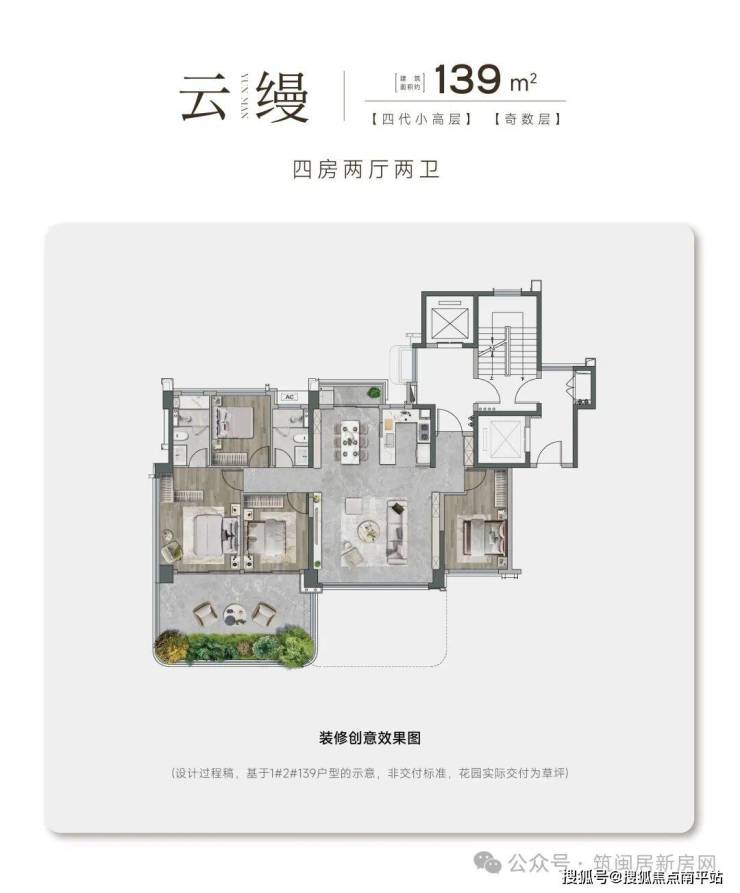 定位是第四代的别墅+第四代复式洋房(如174㎡的复式洋房实际使用面积可达203㎡,得房率高达116%,通过赠送南北双露台、入户花园、飘窗等空间,增加了居住的实用面积。)