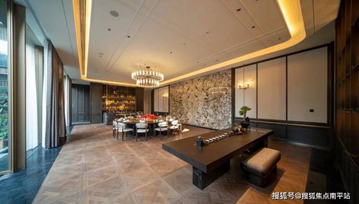 私宴厅内,雪山飞狐透光奢石景墙与紫山水奢石岛台相得益彰,未来可轻松举办圈层家宴与亲友聚会;