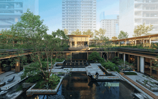 绿城·凤屿观澜打破传统社区平面园林的固有思维,引土海水韵、内生涟漪,打造秀屿首个360°下沉式庭院。设计师顺应地形高差,将垂瀑、艺术绿苑、观景平台与莆阳传统建筑符号(燕尾脊、斗拱)巧妙融合,铺展开一幅立体山水画卷。