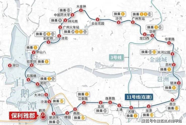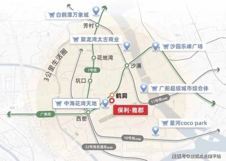 广钢板块不缺地铁,但是严格点讲,缺一个真正的地铁口楼盘,早期最近地铁的中海花湾壹号A区,步行至鹤洞站都要500米,现在保利雅郡距离广佛线鹤洞站A口不到100米,就在项目的东面{鹤洞站A口还在建设当中,预计明年9月底竣工},目前鹤洞站只开通了B/C口,最近的C出口步行至项目也就290米左右,步行4分钟即可,从这里出发,去往陈家祠、农讲所、珠城均是10站以内,而且乘坐广佛线一个站就能到沙涌换乘11号线,11号线换乘的站点非常多,届时通车后,去往琶洲、金融城、天河北等地会更加方便,自驾的话,项目门口就是鹤洞路,走鹤洞大桥去往海珠西也非常方便,周边还有花地大道等干线。