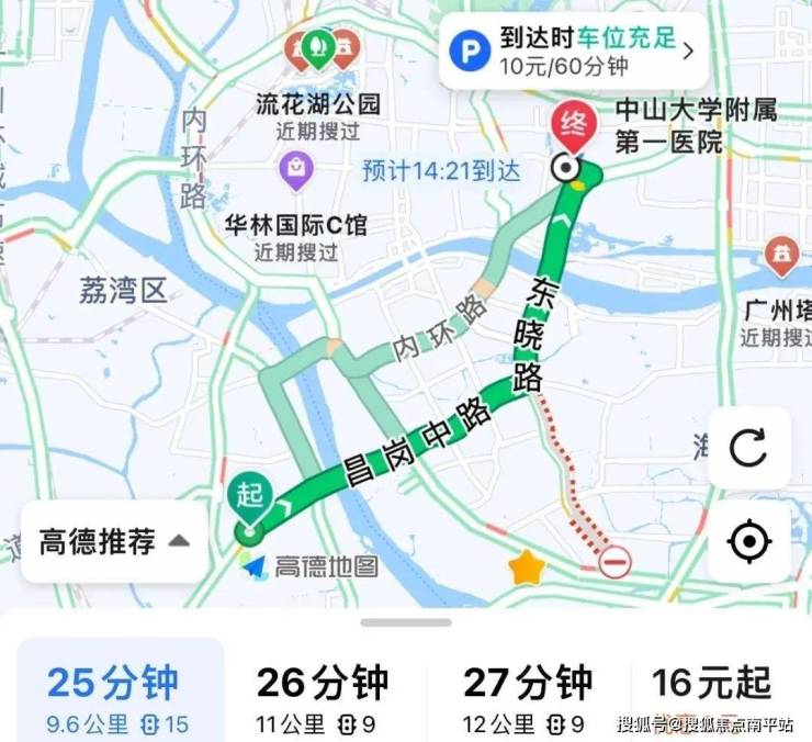 自驾去中山医:走鹤洞路至昌岗中路,再转到东晓路,再转东湖路,全程9.6公里,耗时25分钟左右。