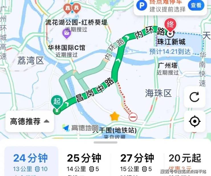 自驾去珠城:鹤洞路转昌岗中路,再转东晓路至内环,全程13公里,耗时24分钟左右。