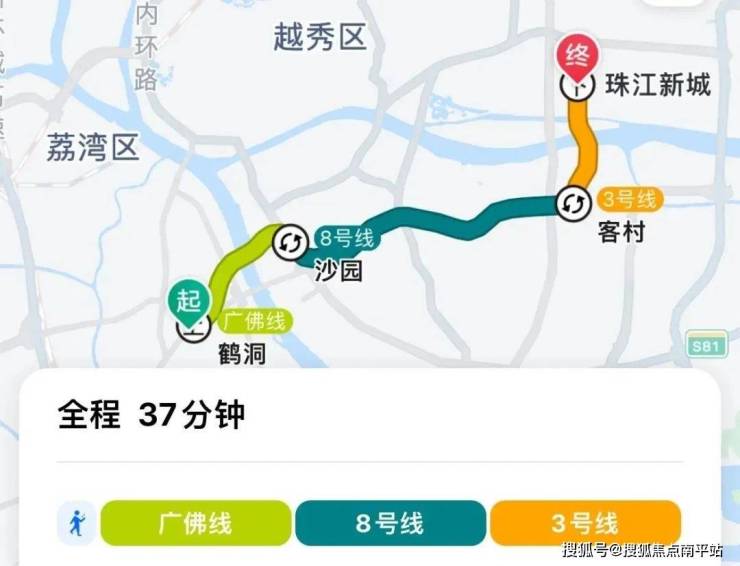 地铁去往珠江新城:乘坐广佛线到沙园换乘8号线,再到客村换乘3号线,全程10个站,耗时37分钟左右。
