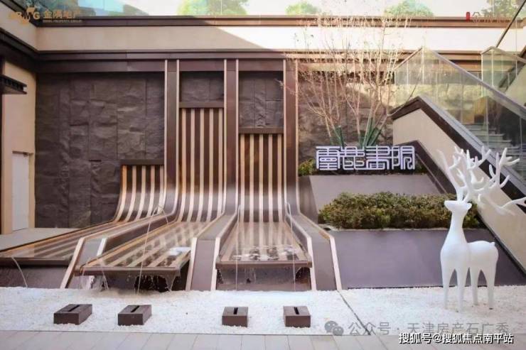 宽约6米的叠水景观,布置以“鹿门月照”为主题的雕塑,提升入口品质与归家礼仪感。两侧的阵列植物形成有机的空间序列。