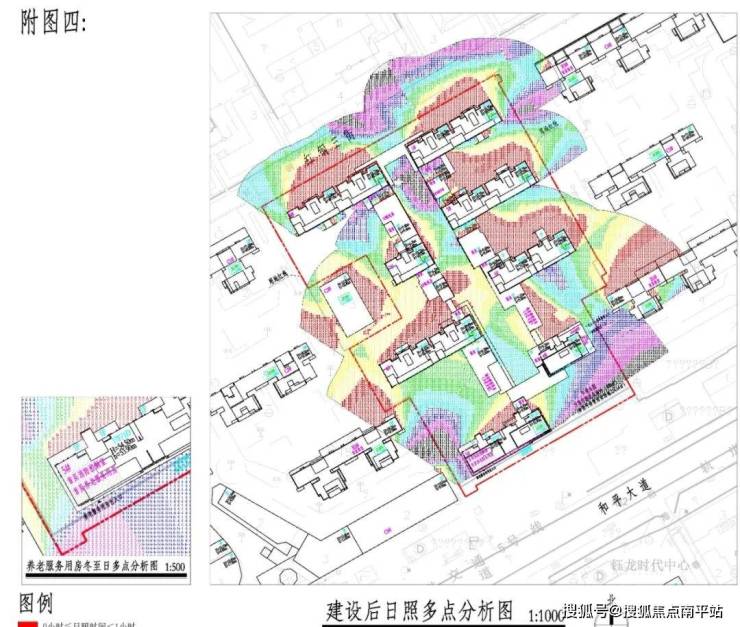 项目地块东、西向都有现存高层建筑,不过从日照图来看,基本没什么影响,各楼栋南侧采光都很充足。