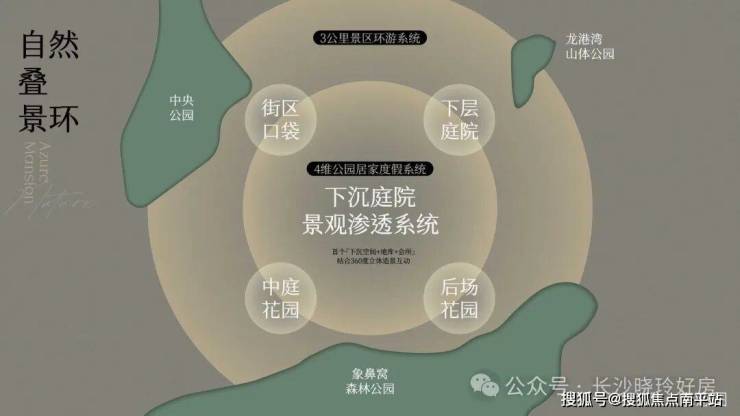 3公里景区环游系统:项目择址梅溪湖三公园心,坐拥象鼻窝森林公园、中央公园(规划)、龙王港山体公园(规划)生态密境,构建3公里自然环游,出门即度假。