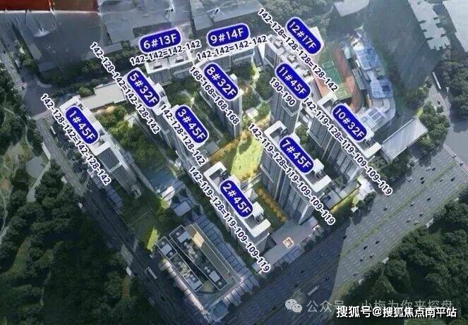 除了6、9号楼为东南朝向,其它楼栋均为西南朝向,与台北路走向平行。6、9、12号楼为12-17层的小高层,1、2、3、7、11号楼为41-45层的超高层,5、8、10号楼为23-32层的高层。 小区一共1805户,面积段约在109-190平,容积率3.36,