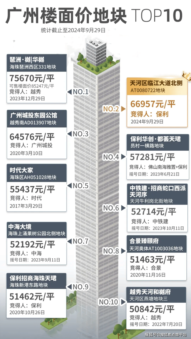 继地价榜第四的员村一横路地块(现保利华创都荟天珺)后,保利在珠江新城再下一城,顺手创造了天河地王。 跻身广州楼面价TOP2,仅次于琶洲地王。