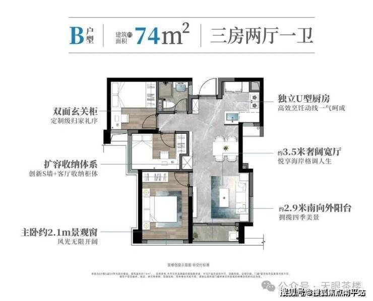 约74平3房 , 综合使用率高达约88%, 采光好;舒适三房, 最小房间都有约8平 ;客厅面宽达约3.5米,超大U型厨房,独立阳台,入户玄关柜+S墙扩容收纳,堪称同级完美户型!