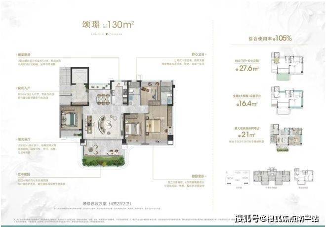 百变空间:约22㎡空中花园(奇数层),6大飘窗累计约16.4米,约105%综合使用率。