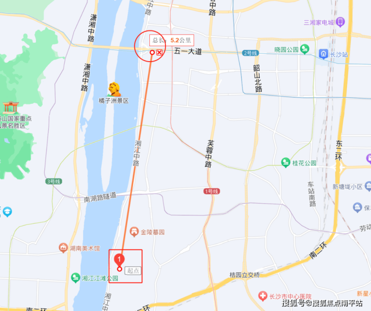 没有地铁,开车沿湘江中路出行,直线距离5公里到五一商圈