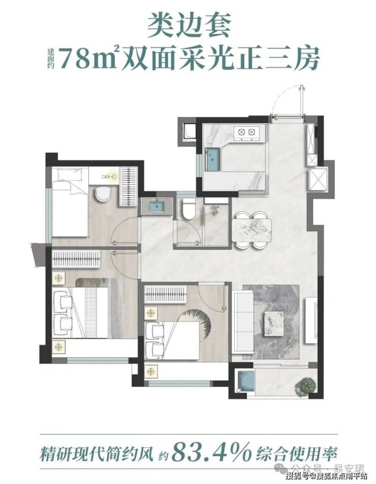 户型设计上,约12.35米南向四开间,保障了最长约6-8h的充沛日照,充分体现了“健康好房子”的产品理念。